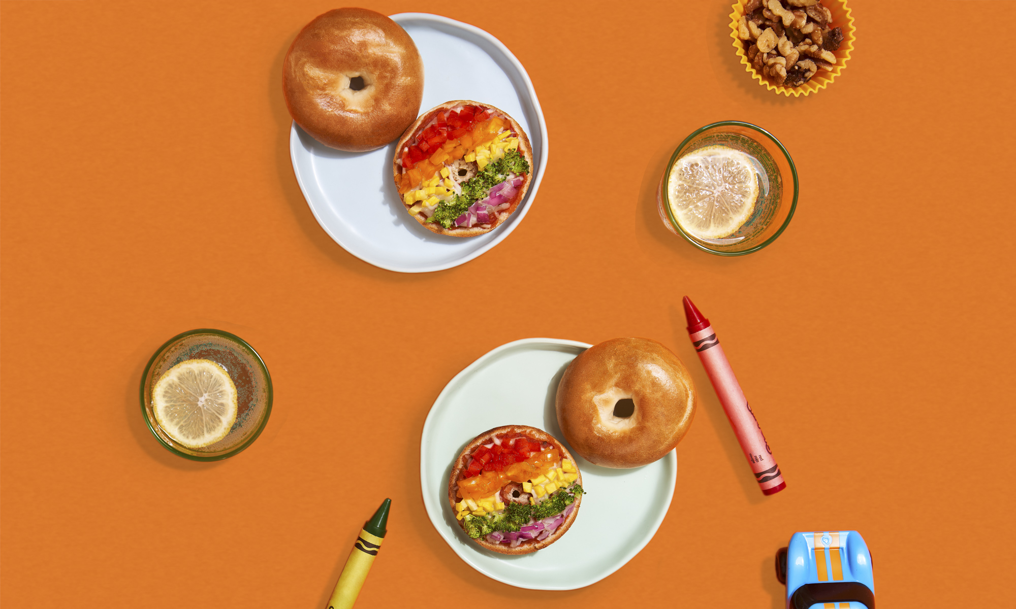 The secret to getting kids to eat their veggies? Build a rainbow, and put it on a Thomas'® Mini Bagel pizza. Easy!