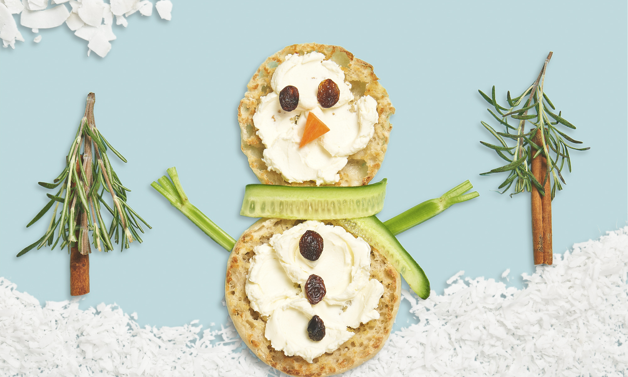 Cooking with the kids can be fun for everyone. Give snack time a festive holiday twist with this English Muffin snowman.